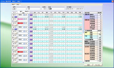 勤務時間帯を決められず、出勤してから退勤するまでの実働時間を集計する例です。